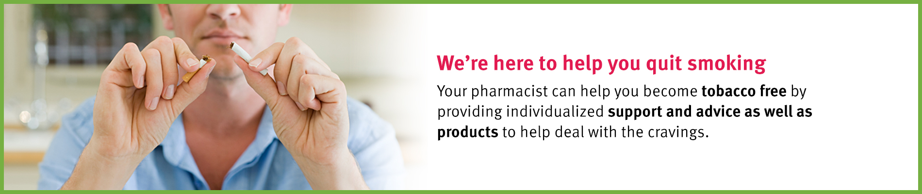 Speak with your Pharmasave pharmacist to arrange a quit smoking consultation and for more information about becoming tobacco free.